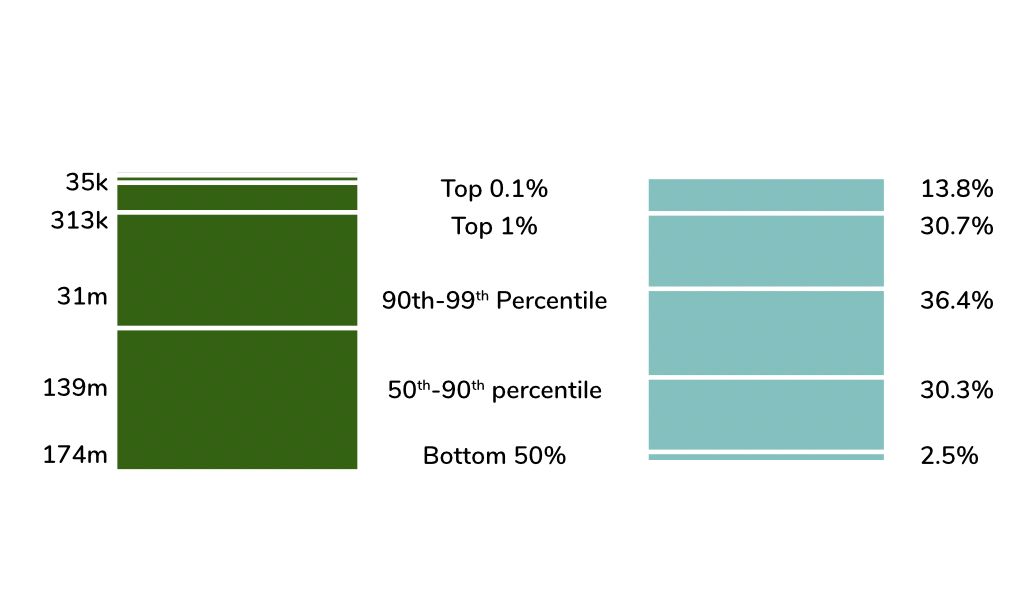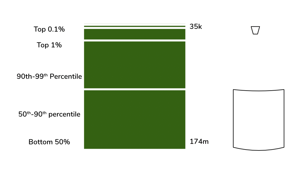 We'll consider the people in that 0.1% percentile to be like a thimble. Thimbles come in different sizes and are generally around 5-10mL of volume. We have a population of 348m, with 0.1% with enough wealth accumulation to be distinctly comparable to the rest of the population. That works out to about 35k. The bottom 50% of our population is 174m. Translate that mL to US standard volume, and that 174m works out to about a 10gal bucket. The volume comparisons are rough, but something that's really easy to go out and get a physical sense of the difference we're talking about. Putting a 2-d graphic together at scale, the thimble is barely seen.