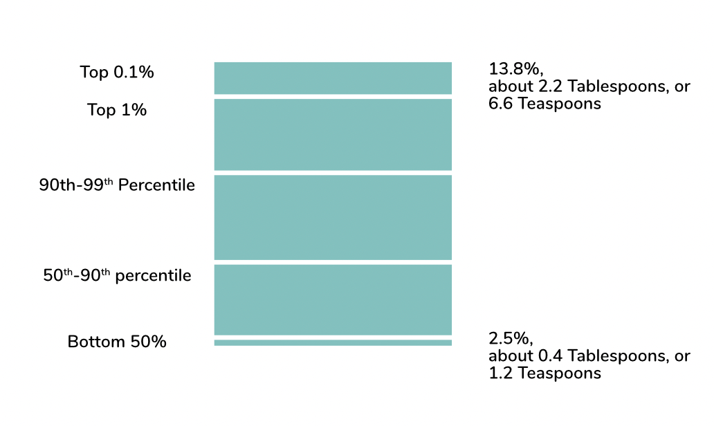 The amount of wealth we have when we think of it in terms of percentiles doesn't change – it's always 100%. What does change is the distribution, and the volume of where it's put: the % wealth and population. So again, we can reach for volumes that make sense to us. Most of us have a set of measures for cups and teaspoons/tablespoons in the kitchen, or know someone who does. So, think about our total economy as being a cup of water, 13.8% of it distributed to the top 0.1%, 2.5% of it to the bottom 50%.