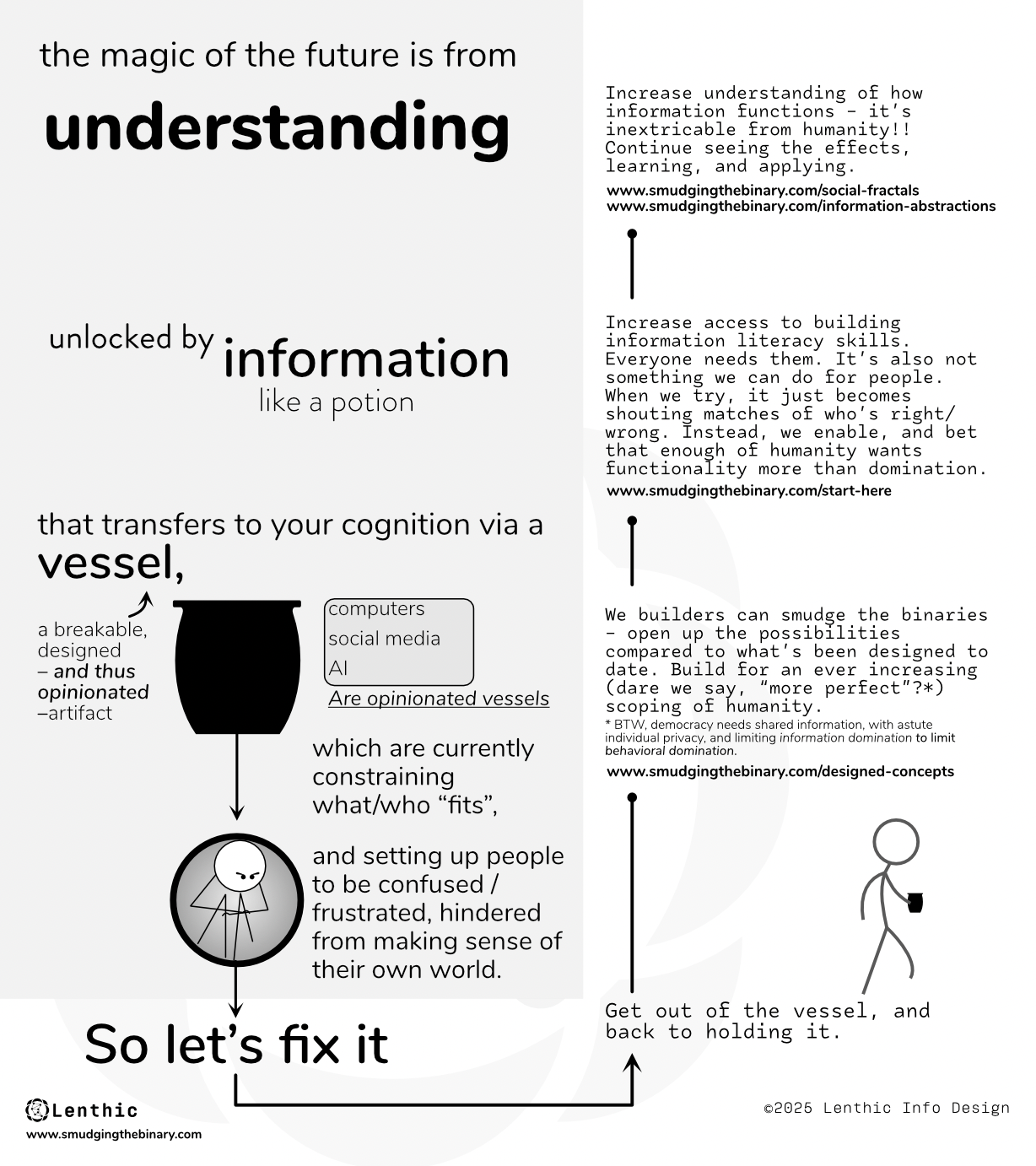 We're information beings. If we poison information, we poison society, cultures, lives. Dysfunctional information is the poison; functional information meshed deeply with reality is the medicine. Not everyone is up for it, and we can't force it. It's a bet, that more of humanity wants function and joy than domination.