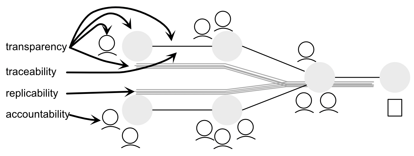 This diagram is simplified. What goes on in those nodes can be very complex, add more people, and even increase depth and nuance to the information and processes. While those arrows pointing out where each shines are useful, the more nuanced reality is that all four are involved in every part of the functional diagram. Transparency has an arrow to node, connection, process, and people; in reality, they all do. What the mechanics assume is that there is information, process, and people involved. It also assumes that sooner or later mistakes will be fixed.