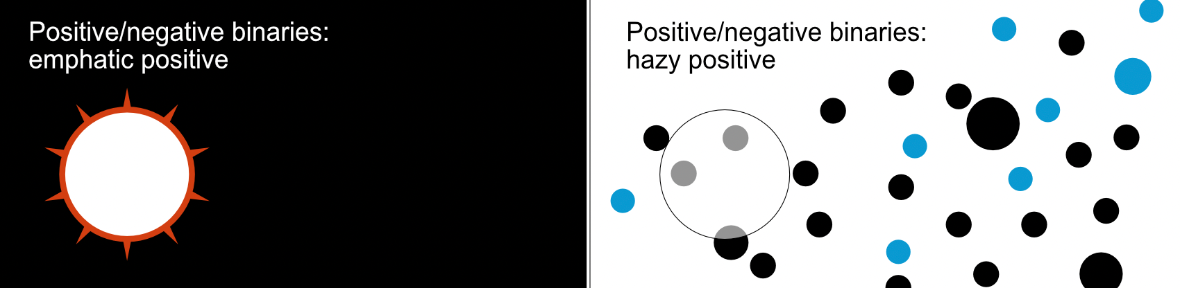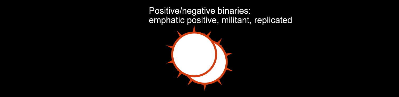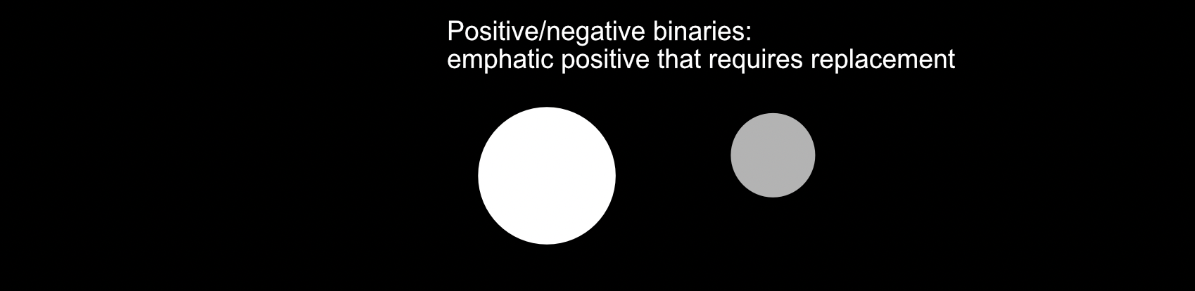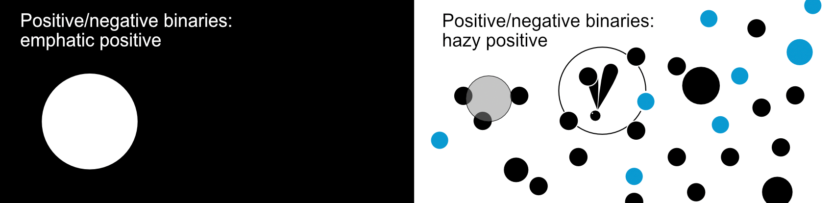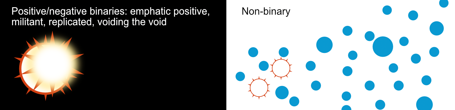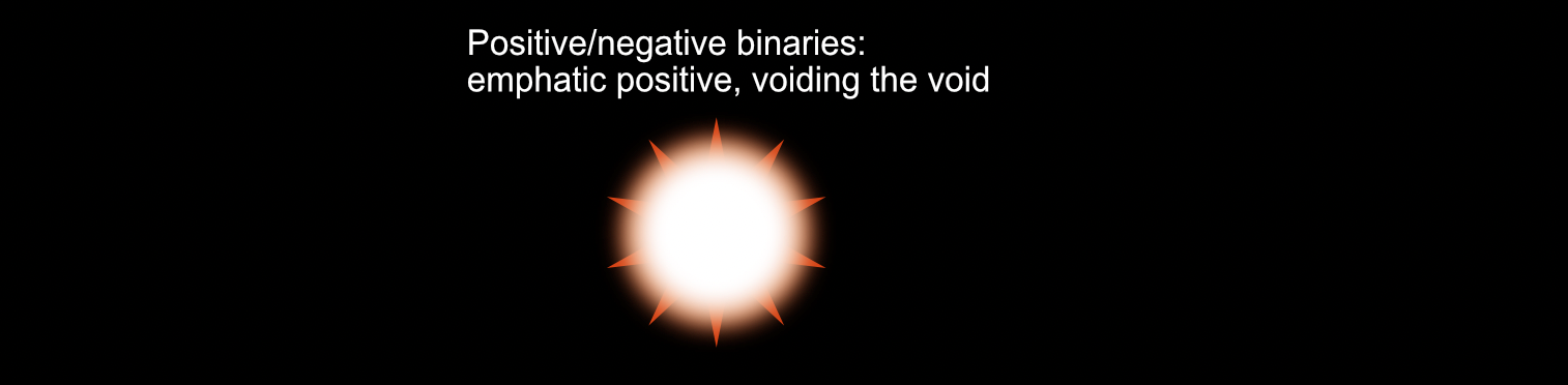 All those smaller nodes in the hazy positive diagram are excluded from perception in the emphatic positive binary. Add them back in, and it's clearly not binary. It's noisy, messy, and intrinsically questions the basis of authority. It's hard to continue seeing the authoritarian as someone special, with more relevance than anyone else. They become unhappy people with visions of grandeur, mollified and coddled so much they will never get out of their own way to learn.